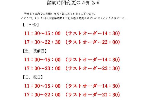 【下町の空 名北店】 営業時間変更のお知らせ
