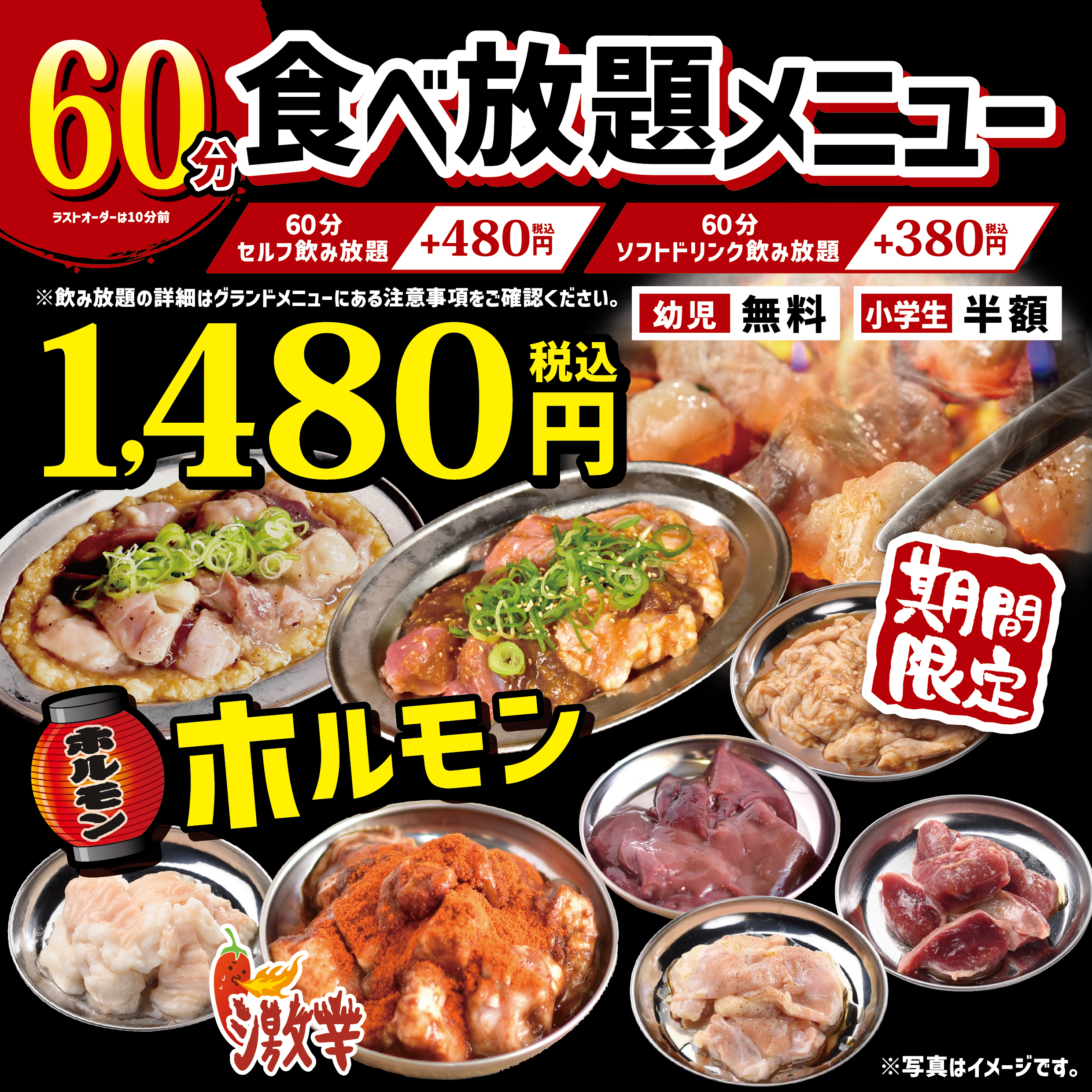 【下町の牛】期間限定|焼肉ホルモン60分食べ放題コース 2026.02.13 期間限定|焼肉ホルモン60分食べ放題コース 焼肉ホルモン 下町の牛に、 期間限定の特別コースが登場いたしました。 下町の牛名物「下町ミックスホルモン」をはじめ、 シマチョウ・ハツ・レバー・ミノ・とんちゃん・鶏ハラミなど、 人気の焼肉ホルモンを60分間食べ放題でお楽しみいただけます。 価格は 1,480円(税込)。 さらに、+480円(税込)で 60分セルフ飲み放題をお付けすることも可能です。 食べて、飲んで、2,000円以下。 コストパフォーマンスに優れた、今だけの特別コースです。 ご利用について ・2名様よりご予約可能 ・食べ放題60分制(フードラストオーダー10分前) ・期間限定コースのため、事前のご予約をおすすめしております